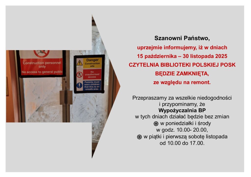 15 października – 30 listopada 2025 Czytelnia Biblioteki Polskiej POSK będzie zamknięta, ze względu na remont Biblioteki.